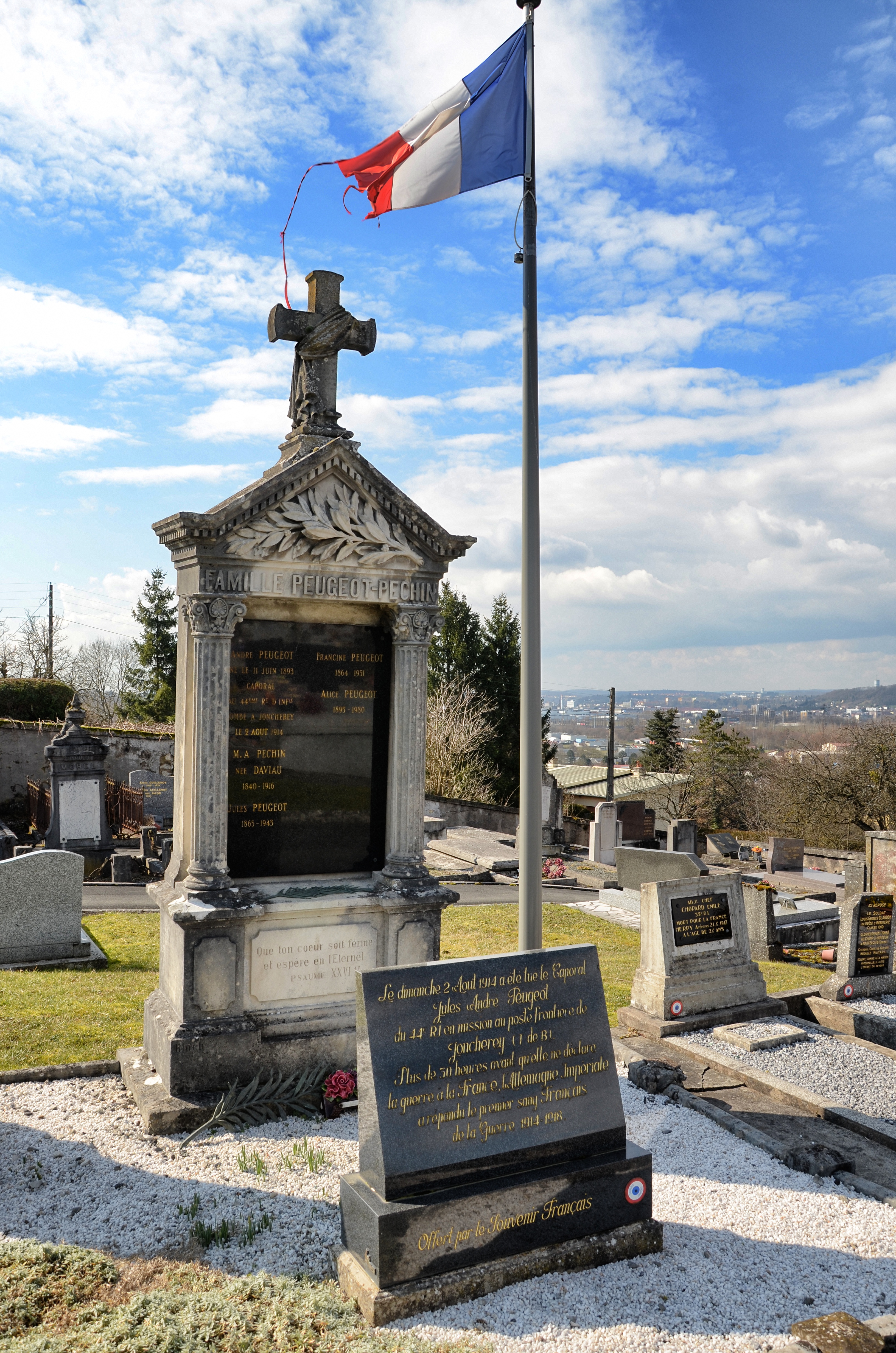 Peugeot is buried in the family grave (seen above) in Joncherey not far from where he was killed.