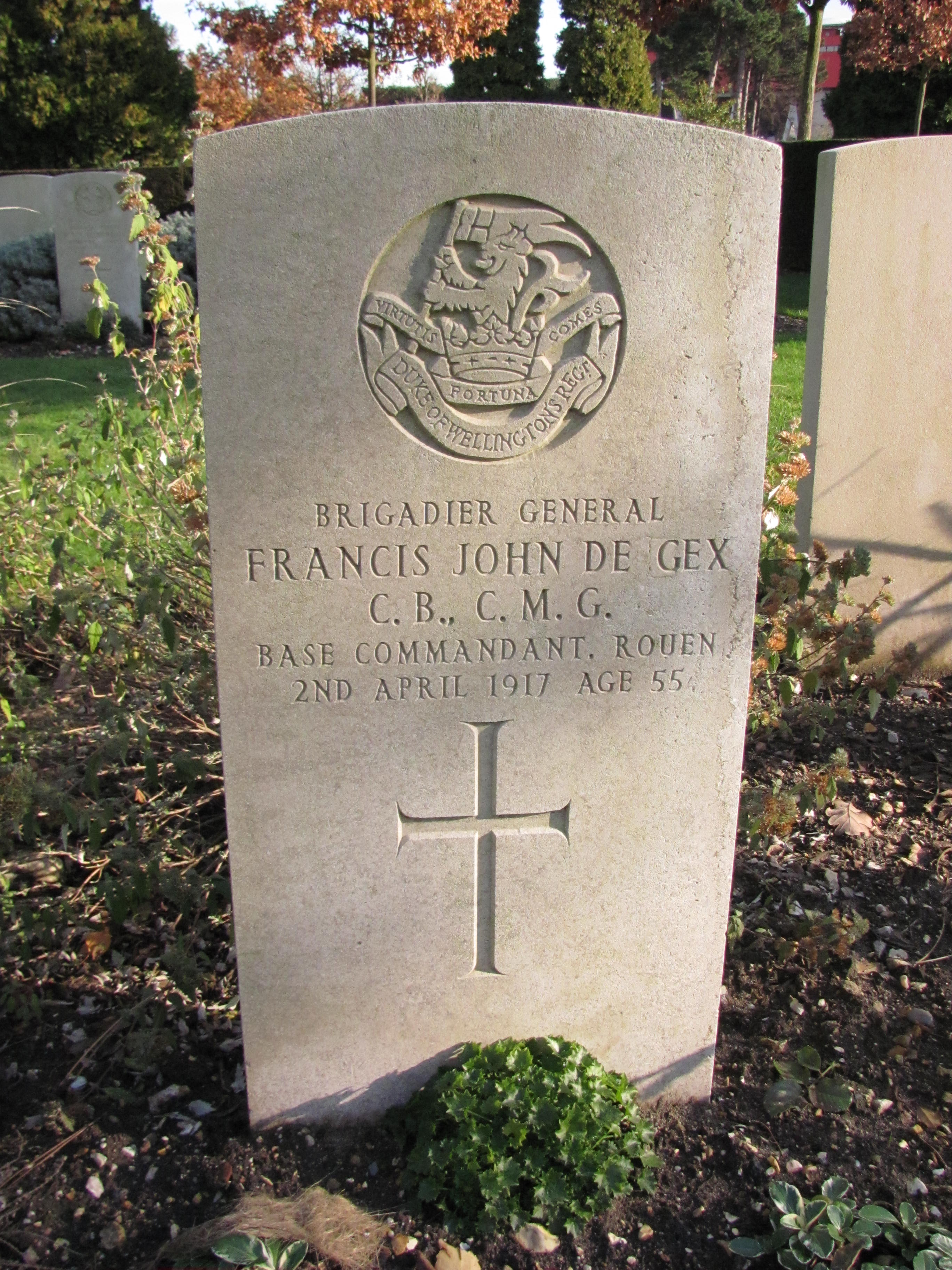 Born at Frome, Somerset. Son of The Rev. F. de Gex,; husband of Edith H. de Gex, of Stone House, Camberley, Surrey. Educated at Oxford and R.M.C. Sandhurst. Commanded 1st Bn. Bedfordshire Regt.